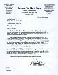 随信附上我的选民盖尔.毕格欧、安那拜尔.铁曼、潘洪义、玛格芮塔.依力查德的来信。他们对李祥春的安全及健康表示关注,要求中国政府立即释放查尔斯.李并使其立即返回美国。