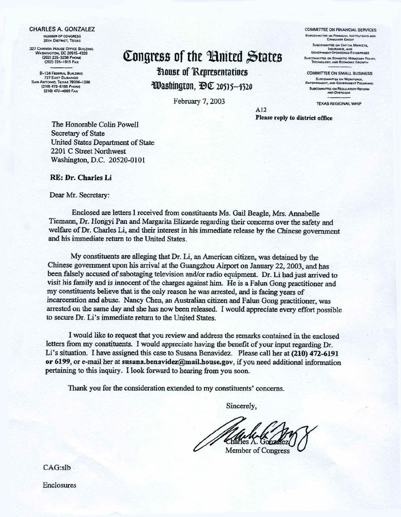 我的选民们说,美国公民查尔斯.李于2003年1月22日到达广州机场时被中国当局抓捕。中国当局毫无根据地指控查尔斯.李破坏电视/广播设备。李祥春只是去中国看望家人,根本是无辜的。他是法轮功学员,我的选民认为这才是他被抓的唯一原因。查尔斯.李正面临长期监禁和虐待。澳洲公民、法轮功学员南希.陈在同一天被抓,现在已被释放。我希望您能尽一切努力促使查尔斯.李立即返回美国。