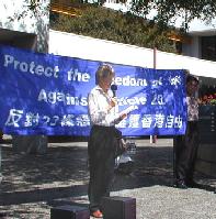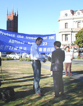 【明慧网2003年3月25日】3月17日至18日,新西兰大法弟子们以及其他各界社会人士共同为反对香港基本法第23条发起了从奥克兰至首都惠灵顿的汽车游行。沿途受到了媒体的关注,在惠灵顿国会大厦前,国会议员、外交关系副主席格兰汉姆-凯利(Graham Kelly)等发言,对这次游行表示了支持。进步联盟党议员Robinson说:“议会的大门永远向你们敞开着,你们可以在这里表达你们的观点而不用担心被警察逮捕……”萨德-辛普森(Ced Simpson)代表大赦国际进行了发言,他谈到在中国大陆以颠覆罪为由对异见人士的是很多的,这包括对中国民主运动,法轮功等团体的迫害;他不希望这种现象在香港出现。