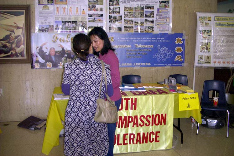 博览会期间,学员们穿插着炼功及介绍法轮功真相。更值得一提的是,许多人都从新闻中知道法轮功在中国遭受迫害的事实,并且希望进一步了解法轮功。