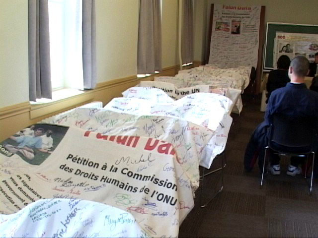 本次新闻发布会上,还展示了蒙特利尔学员征集的、已经送往日内瓦国际人权会议的3000多个签名布绢,呼吁国际社会帮助停止中国当局对法轮功学员的残酷杀戮。到目前为止,已知的被杀害的法轮功学员人数已达637人。