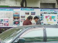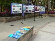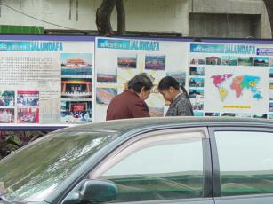 | 真相展板加上各国语文「转法轮」 | 最前面的这张海报是用推车架起来的 |