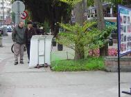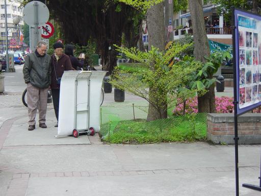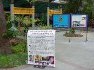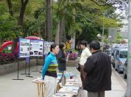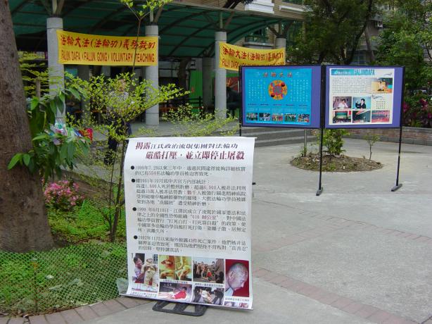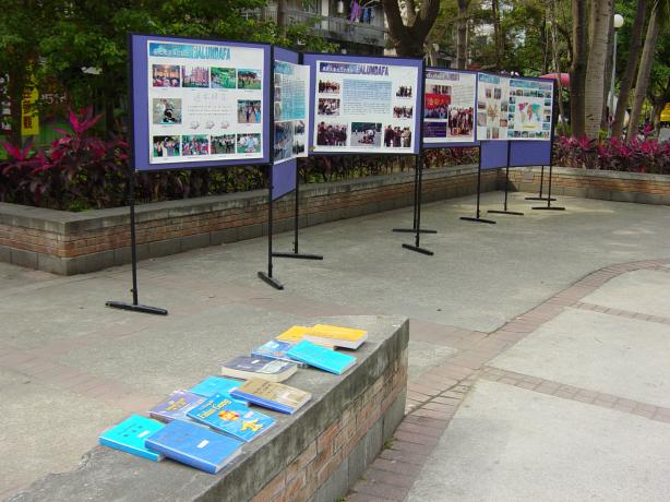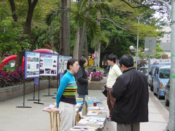 现场的三四位弟子多相互不认识,大家商议着摆了许多文件资料。除了发传单,三天中有许多人前来询问师大哪边有炼功点,我们告诉他们师大暂时没有,但邻近的台大有,附近约30分钟脚程的森林公园也有。民众陆陆续续的观看图片。