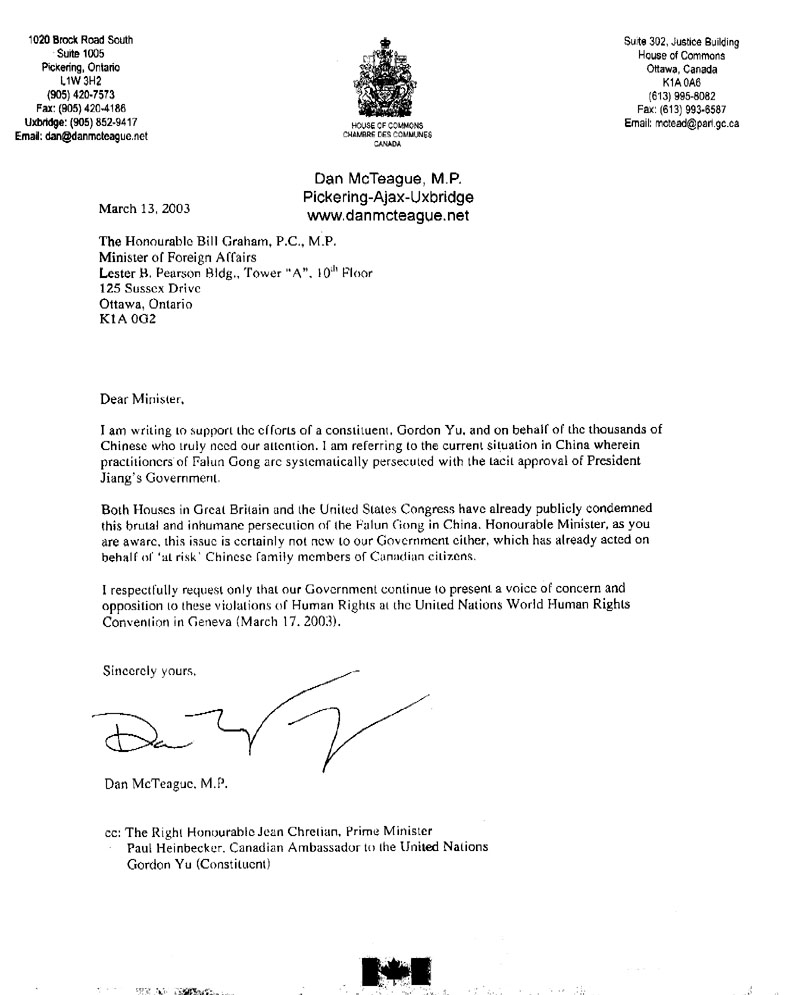 英国两院和美国国会都已经公开地谴责了在中国对法轮功学员残暴的、毫无人性的迫害。尊敬的部长先生,如您所知,这个问题对我们的政府来说也已经不是什么新鲜事了,政府已经代表遭受迫害的加拿大公民的家人做出了行动。
