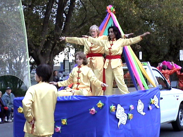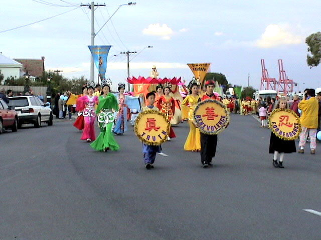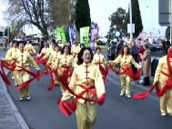 在十几个不同的游行队伍中,由80多人组成的法轮功学员的阵容是最庞大的。弟子的游行队伍经过时,围观群众报以热烈的掌声,一名儿童兴高采烈地大声喊道:“你们是第一名!”