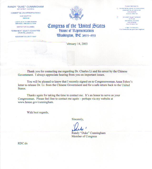 你会高兴地知道我最近在国会议员安娜·伊苏(Anna Eshoo)的信上签了名。该信要求中国政府释放李祥春,并使其安全返回美国。