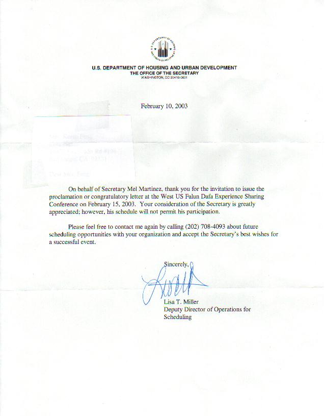 【明慧网2003年3月4日】2003年2月10日,美国住房及城市发展部(U.S. Department of Housing and Urban Development) 部长梅尔·马特尼兹(Mel Martinez)先生委托其日程规划部副主任丽莎·米乐女士致信法轮功学员,最衷心地祝愿美西法轮大法法会的成功召开,并希望学员能随时电话通知其有关法轮功的未来活动安排。该信的全文如下: