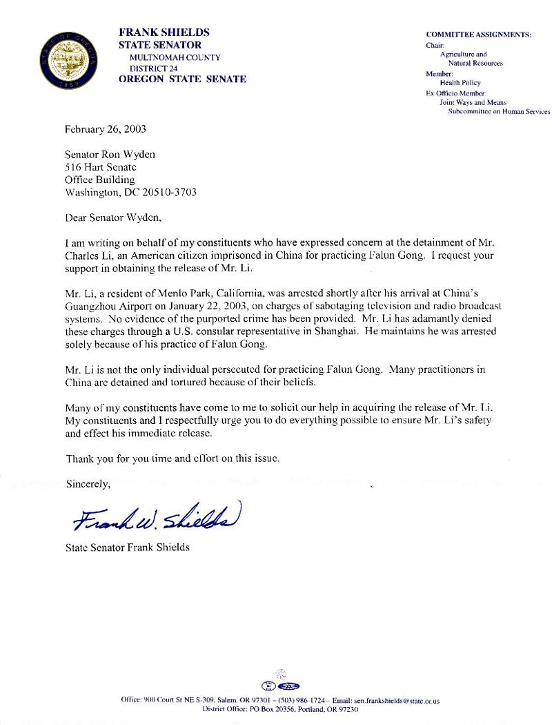 我代表我的选民给您写信,表达对查尔斯-李先生遭到拘捕一事的关注。李先生是一位美国公民,因炼法轮功而在中国被监禁。我请您支持营救李先生的活动。