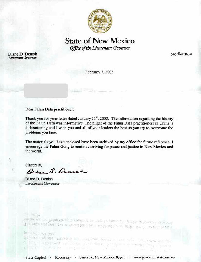 本办公室已经把你们寄来的材料归档,以备将来查询。我鼓励法轮功继续为促进新墨西哥州和全世界的和平与正义而努力。