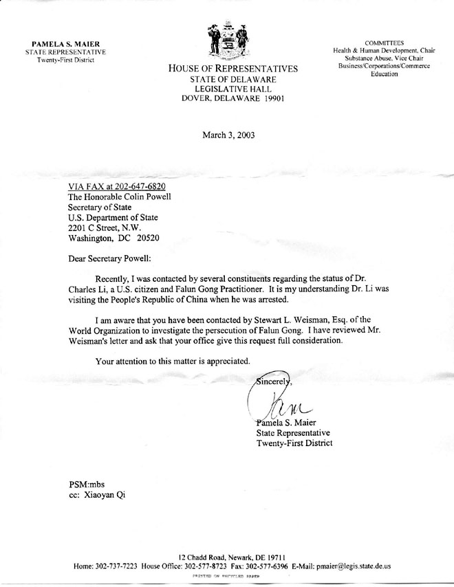 最近,我选区的多位选民就一位美国公民,法轮功修炼者李祥春的情况跟我联系。据我了解,查尔斯.李是在回中华人民共和国探亲时被捕的。