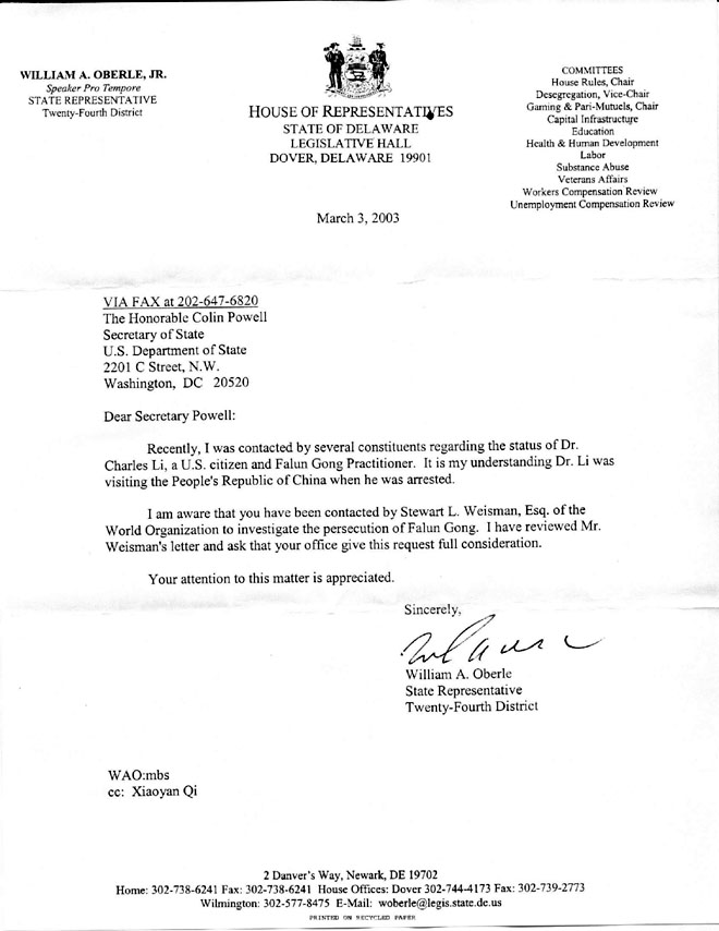最近,我选区的多位选民就一位美国公民,法轮功修炼者李祥春的情况跟我联系。据我了解,查尔斯.李是在回中华人民共和国探亲时被捕的。