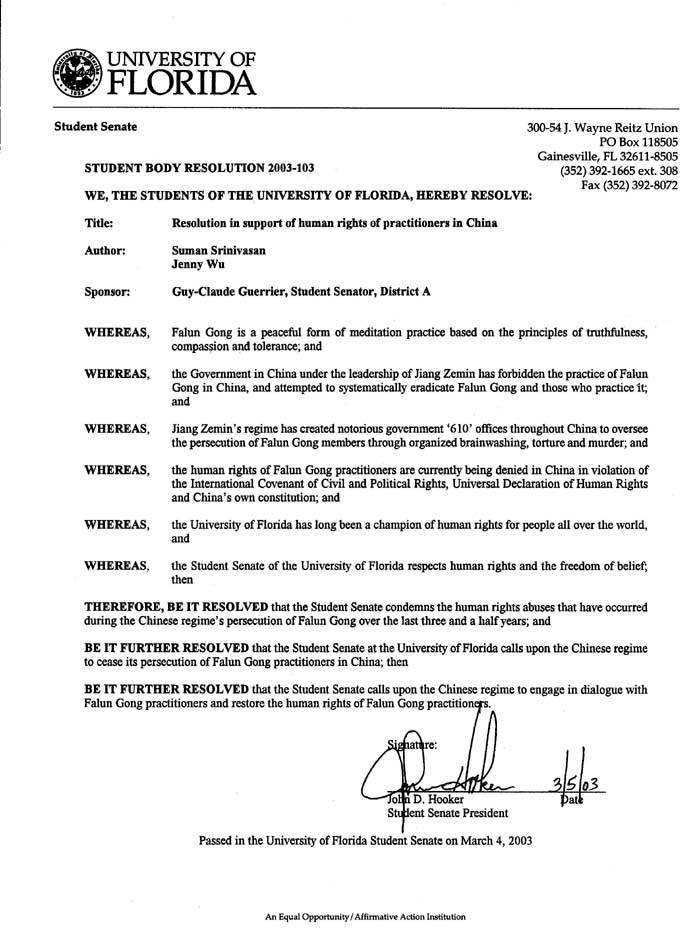 并且决定,佛罗里达大学学生评议会呼吁中国当局在中国停止迫害法轮功;