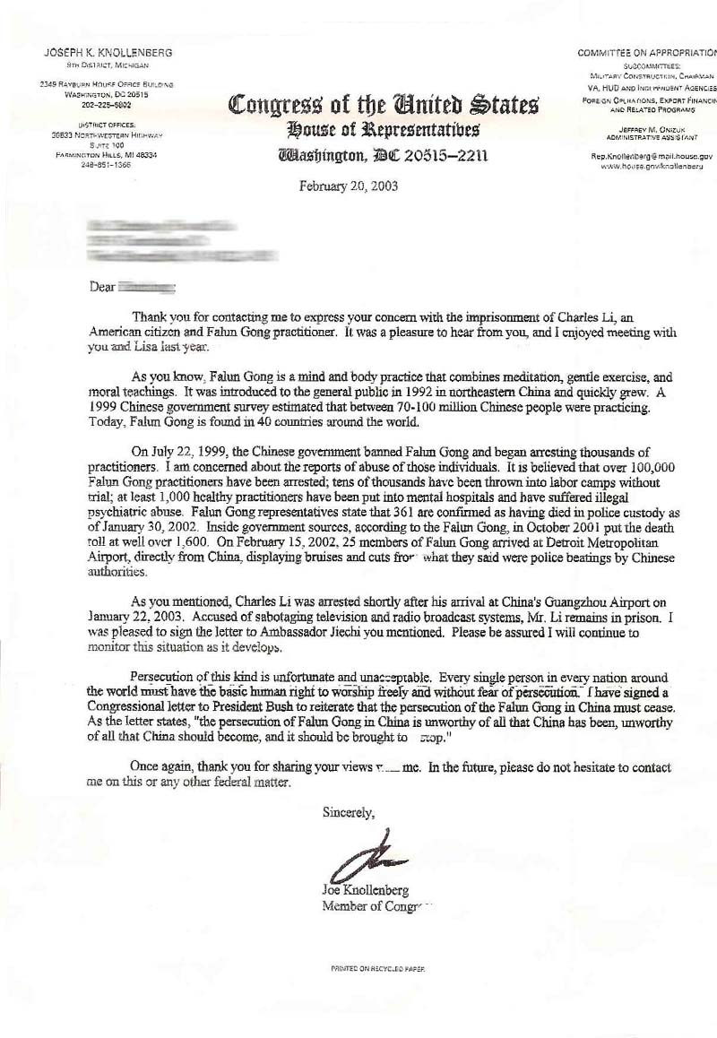 诸如此类的迫害是不幸的和不能容忍的。世界上每个国家的每个人都必须享有自由信仰的基本人权,而不必担心受到迫害。我已在议会致布什总统的信上签名了,信中重申中国[江氏政府]对法轮功的迫害必须停止。信中说:“中国[江氏政府]对法轮功的迫害与中国的发展是不相称的,与中国应该达成的目标也是不相称的,应该马上停止。”