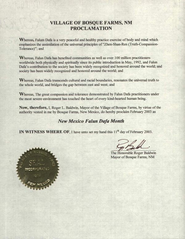 美国新墨西哥州波斯克镇颁布“法轮大法月”褒奖令 【明慧网】