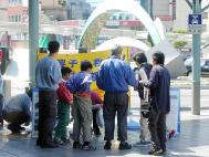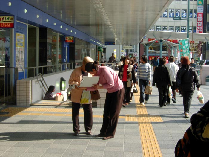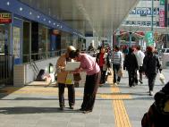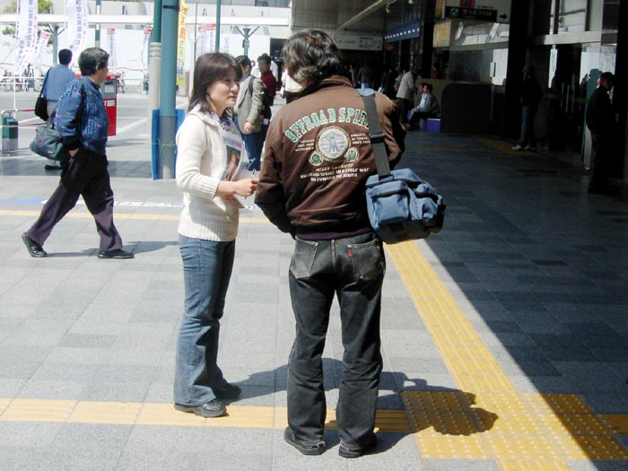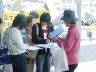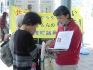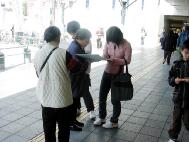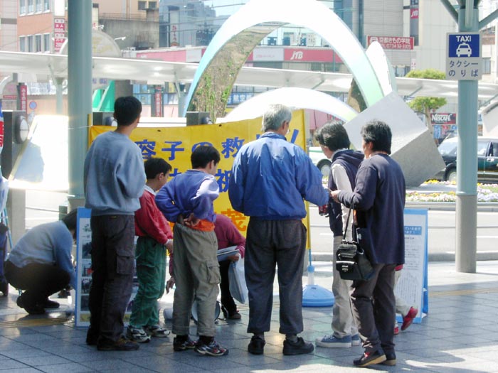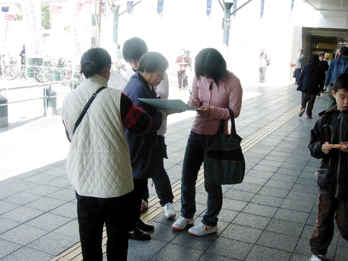 | 学员在向路人讲真相 | 一位学员拿着几块征签板同时征签 | 一个来和歌山游玩的日本家庭在观看展板横幅上的文字 |