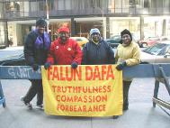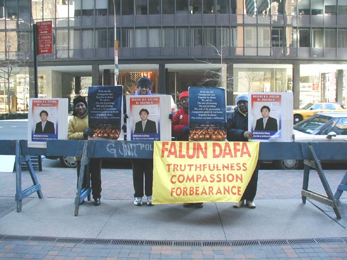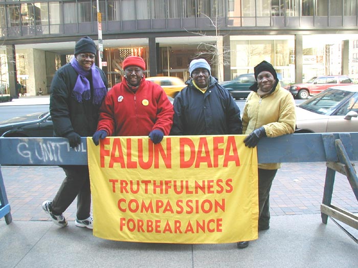 【明慧网2003年4月10日】历时五天的纽约非裔法轮功学员发起的连续静坐活动于上个星期日(4月6日)中午时分顺利结束。主动发起这项静坐的是9位黑人学员,其中一位24岁的年轻小伙子,6位奶奶级大妈,还有两位也是快50了。江氏集团丧心病狂地镇压法轮功,善良的修炼人,特别是对美国公民的迫害使他们迫切地感受到要呼吁美国政府,媒体及美国公众对发生在中国的对法轮功学员迫害的更多关注,并呼吁社会各界伸出援手,紧急救援被江氏集团非法迫害的美国公民李祥春先生。
