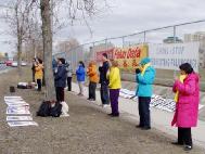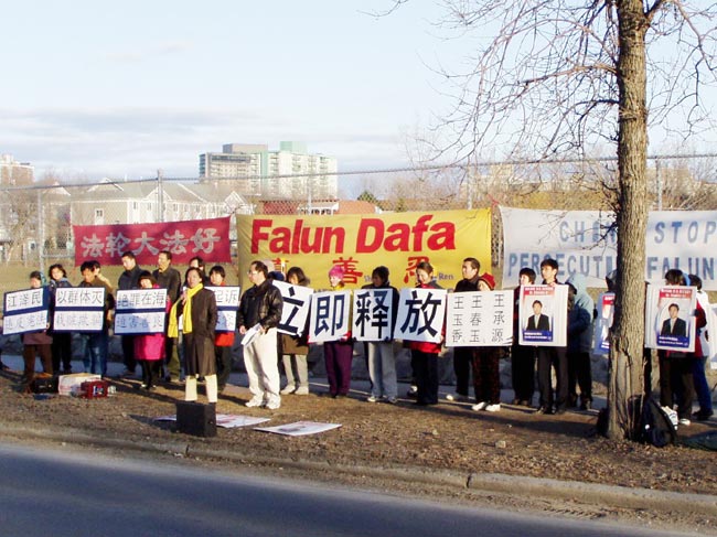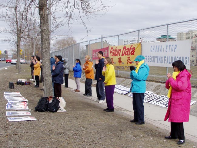 【明慧网二零零三年四月十五日】4月12日下午2:00左右,渥太华及蒙特利尔学员集中在中使馆前,开始了连续两天的周末集体发正念,全力排除干扰,支持在美国以“群体灭绝罪”起诉邪恶之首。同时呼吁紧急营救最近被中国政府非法审判的美国公民李祥春。