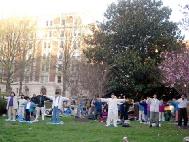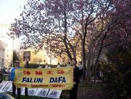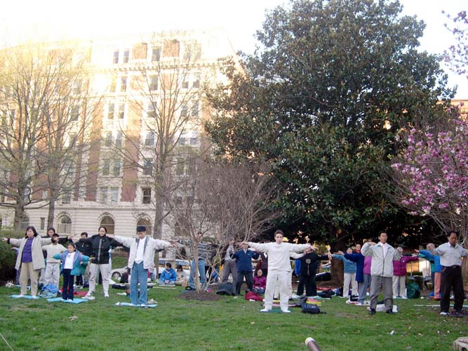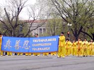 | 华府法轮功学员4月12日在中国驻美大使馆前炼功。 | |