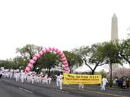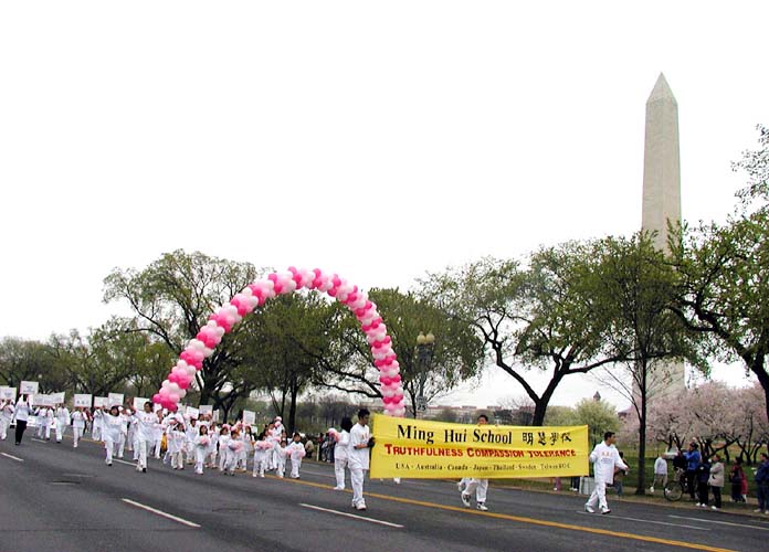 四月五日,美国华盛顿首都每年一度的大型樱花节游行,法轮功队列备受瞩目,明慧学校的队列被排在全美七十多家参加游行团体队列之首,为游行开道。中国内地来美国的旅行团看到此场景,惊讶地说不出话来。一位学员告诉国内旅行团游客说:“请你回去转告你所看到的情况,法轮功学员走在美国华盛顿著名的康乃迪大道上,而且为全美国其它队列开路。为何全球各国如此尊重法轮功,而在中国,法轮功却要遭到镇压?”