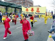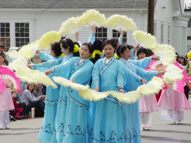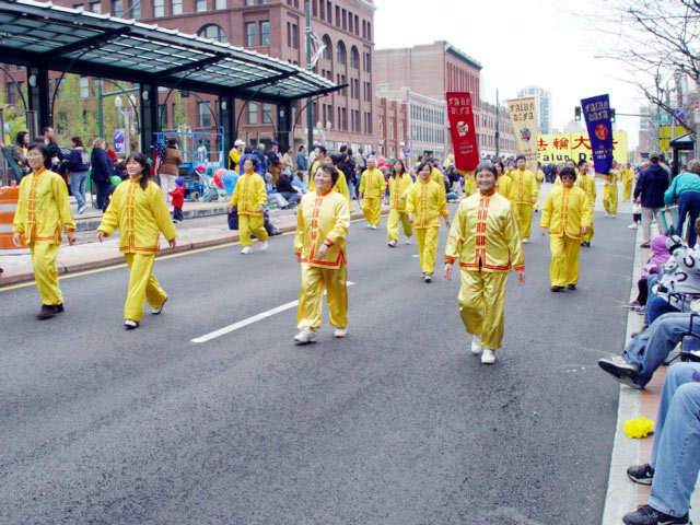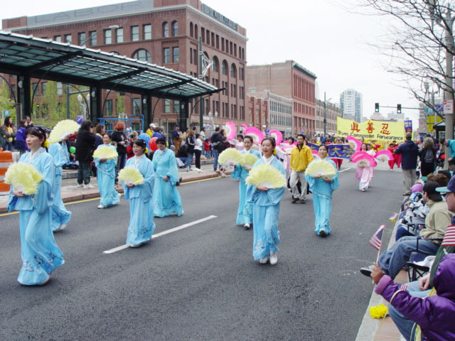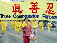 三位十来岁的小弟子,举着“法轮大法”的横幅微笑地走在法轮功学员队列的最前面。接着分别是穿着蓝色古装和粉色服饰的两队女弟子表演扇子舞,绚丽的色彩,轻盈的舞姿,宛若天女下凡。跟着的是穿桃红色民族服装的,手捧着水仙花的女弟子,她们边走边向四周热情欢呼的观众赠送水仙花。再后面是穿金黄色炼功服的学员,他们边走边演示动功动作。最后面是高举“法轮大法”, “真善忍”旗帜的队伍。