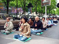 参加昨天这项集体炼功行动的法国法轮功学员有四十多人,在中国大使馆前方街头盘膝而坐,依音乐操演、静坐、炼功,同时散发传单,说明他们以「真、善、忍」的精神修炼,如何受到中共当局迫害的情形。