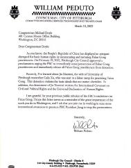 如您所知,中华人民共和国对法轮功学员的监禁和酷刑折磨表明它对基本人权的蔑视。2002年2月19日,匹兹堡市议会通过了一项决议要求中国政府立即停止对法轮功学员的迫害,并立即释放所有被监禁的法轮功学员。