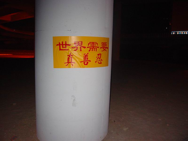图一:“世界需要真善忍”在北京二环公路,某立交桥下。每天即使是午夜每分钟也会经过3-5个人,清晨更会达到每分钟50人左右。初步计算能有三四千人见证了大法弟子们的伟大!