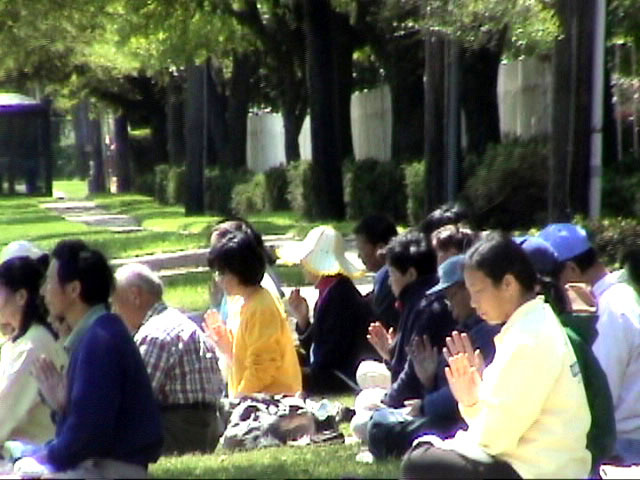 【明慧网2003年4月2日】3月30日星期天中午,休士顿大法弟子来到中领馆(官邸)外面的公用草坪上炼功和发正念,展板上写着“释放美国公民李祥春”及横幅“法轮大法好”与“中国停止镇压法轮功”等。休士顿气候正值盛夏之初,温度较高,又是中午,但是很多大法弟子仍赶来参加,有的还带着孩子,还有一大法弟子全家14人修炼法轮功,除了部份在外地,其他家人全部赶来参加,也有一位弟子从奥斯汀开车,与瑞士中西两位大法弟子一道赶来参加了这次呼吁活动。大家表示,中国政府肆意拘捕审判美国公民,是其迫害法轮功的进一步延伸,是绝不能认可的,李祥春修炼法轮功没有罪,想以和平的方式将真相告诉被蒙蔽的祖国人民不但没有罪,更是正义勇敢之举。参加呼吁活动的学员们强烈要求中国政府立即无罪释放李祥春。