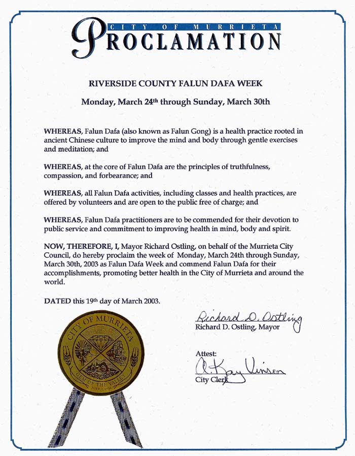因此,我,理查德-奥斯特苓市长,代表玛里艾塔(Murrieta)市政议会,宣布从3月24日星期一到3月30日星期日为玛里艾塔市的法轮大法周,并且赞扬法轮大法所取得的成就,赞扬法轮大法在玛里艾塔市以及世界各地促进人们的身心健康。