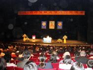 法会会场,学员发言。(注:此图片系多张照片的组合)19日,上千位来自世界各地区的法轮功学员们参加了在纽约市的数项正法活动;下午4时半,学员们来到纽约州立大学谱切士分校的艺术中心,举行了“如何智慧地讲清真相”的专题心得交流。