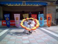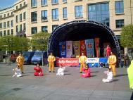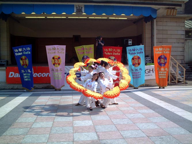 下午一点二十分,参加表演的学员们,穿上五彩缤纷的中国传统服装,举着绚丽的上面印有法轮图形和“真善忍”的大法横幅,从彩排地点出发到表演的地方,就像一个小型的游行。只有三位学员留守在这里,继续演示功法和征签。一路上有人好奇地询问法轮图形,学员们就向他们解释;也有人问从哪里可以买到我们的服装。大家也一路上向游客发真相传单。还时不时能听到人喊,“看,法轮功!”有个人对我们说,“去年在曼城就看到过你们的功法表演和扇子舞,非常好。我知道对来自大陆的你们来说,情况很艰难。”
