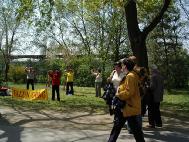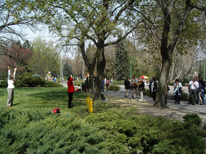 玛格丽特岛是一个坐落在多瑙河中的美丽的公园,正逢节假日,很多市民和游客在此观光。学员们在公园入口处一侧的草坪上立起法轮功的横幅,随着祥和的音乐部分学员炼功发正念,部分学员向过往的游人发放真相资料并进行讲解。平和的音乐和炼功场面吸引了众多游人驻足观看。