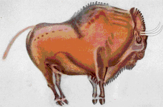 这是在西班牙北部的阿尔塔米拉地区(Altamira)洞穴中发现的野牛(Bison)岩洞壁画。这幅画运用了四种色彩,颜料是以矿物质制成,不会随着时间久远而褪色,保存了16000年仍然鲜明如故。铁质的颜料可以表现红色、黄色及棕色,而黑色颜料的成分是二氧化锰。显然当时的人类就具备了高超的绘图能力,而且同时有进步的绘图工具及颜料。