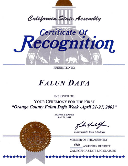 尊敬的肯-玛道斯阁下(签字:Ken Maddox)州议会成员加州第68选区
