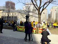 【明慧网2003年4月26日】4月25日中午,加拿大多伦多法轮功学员在政府大厦前举行了“呼吁释放在中国被的法轮功学员亲属”的黄丝带征签活动。过往的路人在一条黄色的缎带上签名,呼吁加拿大各级政府谴责中国政府一贯的谎言和迫害及其给加拿大人带来的伤害。这次活动通知了当地中英文媒体。多伦多部份法轮功学员参加了这次活动。他们中有的向路人征签,有些在签名的黄丝带后静静地炼习法轮功五套功法。