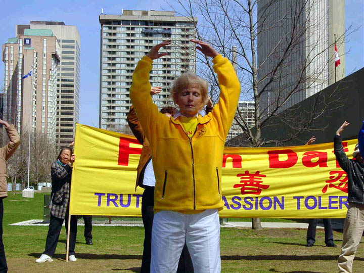多伦多法轮功义务发言人邱楠楠女士介绍说:“四年前的今天,为了争取自由炼功的权利,上万名法轮功修炼者来到北京和平上访,向世人展现了真、善、忍的风貌。然而江氏政府却藉此开始对法轮功修炼者进行残酷迫害;为了使其打压合理化,江氏制造大量诬蔑法轮功的谎言向海内外传播。在过去的四年,法轮功学员一直在揭露中国政府在法轮功的问题上所制造的一切谎言。同时,法轮功学员也因讲真话付出巨大代价,仅多伦多就有13名亲属因修炼法轮功在中国的劳教所和监狱遭受迫害,其中两名已被迫害致死。国际特赦组织、人权小组和国际组织也公开了成百上千的迫害致死和案例。我们呼吁中国政府停止一切谎言,是为了保护中国人民和加拿大人民的利益。”