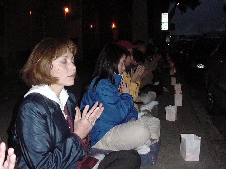 请愿活动从上午10点钟开始,学员们就坐在领馆的对面持续的发正念,夜幕降临后,他们又点燃了一个个烛灯,纪念被江氏集团迫害致死的数百名法轮功学员。请愿活动直至晚上10点钟结束。