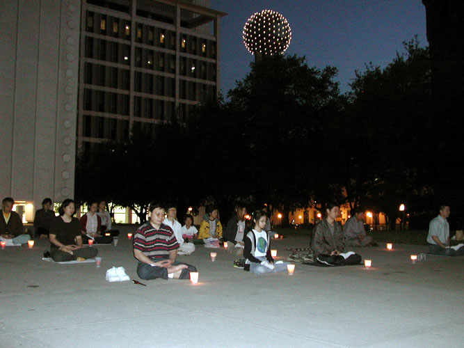 【明慧网2003年4月27日】四月二十五日傍晚,德克萨斯州达拉斯市的法轮功学员在达拉斯市市中心的肯尼迪广场(JFK PLAZA)进行了三个小时的集体炼功、烛光守夜、发正念活动,纪念