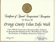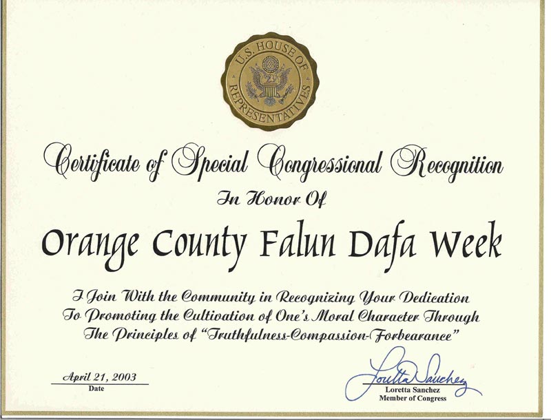 我与橙县社区民众一道表彰你们为弘扬通过“真善忍”原则修炼道德品质所作的奉献。