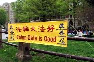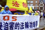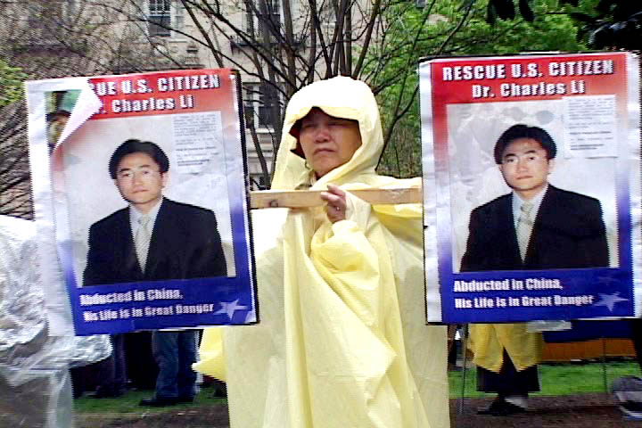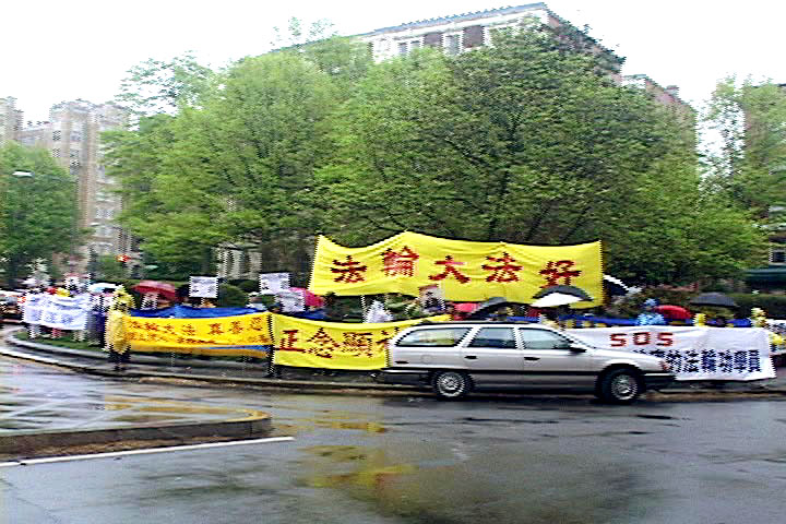 2003年4月25日,天下着雨,来自华盛顿地区的法轮功学员在中国大使馆前举行了新闻发布会,纪念4.25这一伟大而殊胜的日子,同时谴责和揭露江氏集团四年来用谎言欺骗世人,并要求立即停止对法轮功的,要求立即释放美国公民李祥春。
