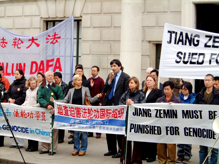 【明慧网2003年4月28日】4月25日,英国部分大法弟子在伦敦中国大使馆对面召开了新闻发布会,纪念1999年4月25日北京万人和平请愿四周年。会上,英国大法学会主席彼得-贾浩和前英国外交部外交次长佛朗西斯勋爵分别发表演说,呼吁善良的人们共同关注今天法轮功在中国遭受的。伦敦学员朱宝生、谢卫国也分别发了言,恳请英国政府帮助营救因修炼法轮功、信仰「真善忍」而被捕的朱宝生胞妹朱宝莲,和谢卫国未婚妻朱永洁。下午3时,朱宝生、谢卫国和另一名大法弟子来到首相府所在地--唐宁街十号,向首相秘书递交了请愿信和有九千五百多人签名的征签表。首相府外,学员们展开法轮大法的横幅标语,齐发正念。