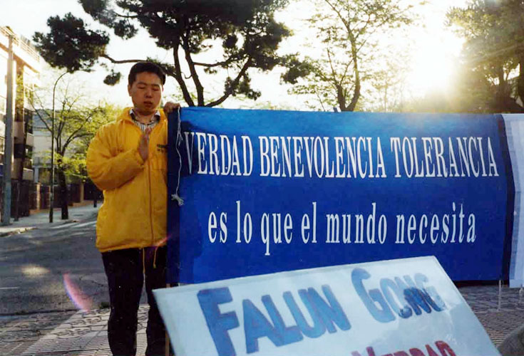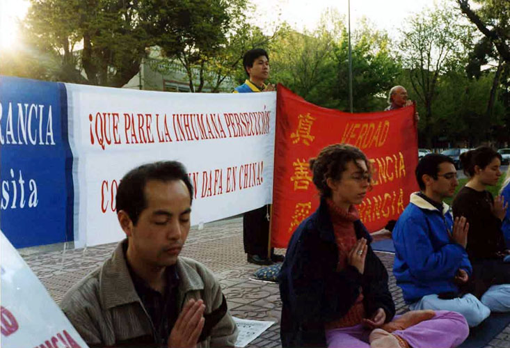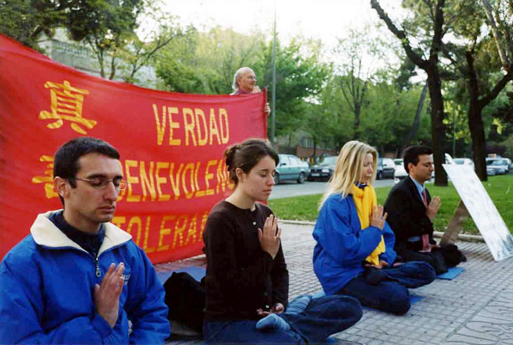 【明慧网2003年4月29日】4月25日,西班牙法轮功学员来到中国驻西大使馆前,纪念四年前的4.25万名法轮功学员和平上访的伟大壮举,纪念在四年的镇压中被无辜