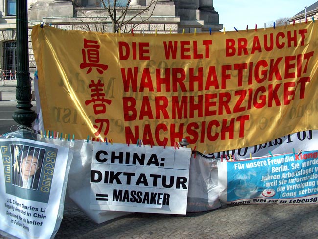 当日气候恶劣,狂风大作,学员们不为所动,坚持展示祥和的音乐和五套功法。展示的横幅无数次被狂风刮走,甚至撕裂,学员们无数次地粘补、修复,再挂上。狂风中,学员们频频发正念,每次发完正念后风就停了。中西学员们不断地向路人讲述江氏疯狂迫害善良的法轮功修炼者的事实真相,发动愿意签字的德国民众接力在熟人中征签,之后马上邮给议会主席、外长及联邦总统。柏林有很多俄国游人,俄裔大法弟子就用家乡话讲真相。