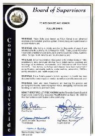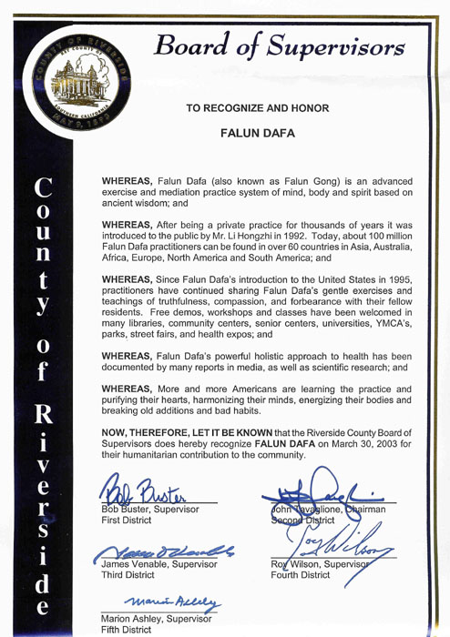 因此,河畔郡监事委员会特此于2003年3月30日宣布褒奖法轮大法,嘉奖他们对本社区的人道主义贡献。
