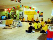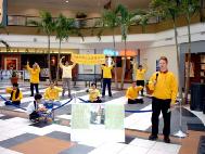 健康博览会的组织者专门为我们提供了功法表演的场地。表演场地位于购物中心一层各进出口的汇合地。来来往往的人们,还有上下楼电梯上的人们都能很好地观看我们的表演。在学员们表演功法的同时,一西人学员用麦克风向观众及行人简单介绍功法功理并回答问题,使整个表演达到了更好的效果。很多观众主动索要真相传单,打听当地学法炼功的时间和地点等情况。有些观众当场跟学员学起了动作,整个场面十分感人。