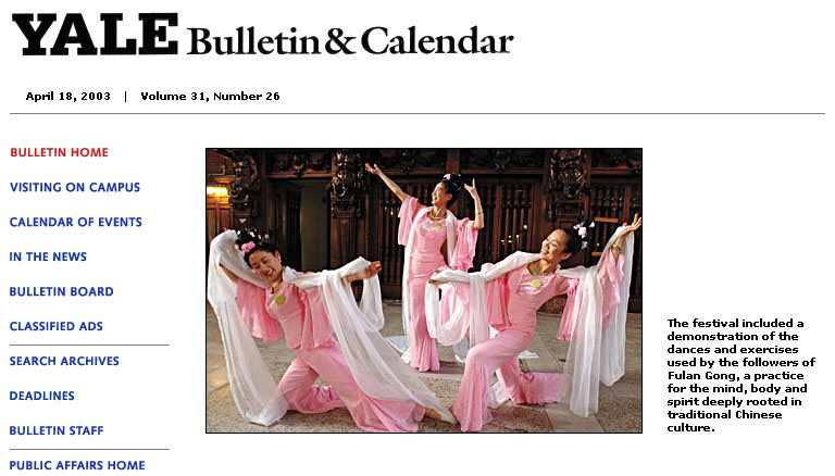 耶鲁大学法轮功俱乐部也参加了这次活动。大法弟子表演了自己编排的舞蹈,演示了五套功法。优美的舞蹈和整齐的功法表演吸引了大量观众和阵阵掌声。耶鲁大学校刊Yale Bulletin把法轮功的照片和介绍放得最大在4月18日的一期首页登出。