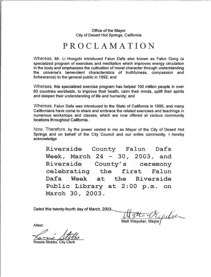 因此,我以沙漠温泉(Desert Hot Spring)市市长的名义,代表市议会和我们整个社区,特此认可2003年3月24至30日为河边郡