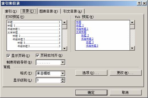 Word 2000默认的目录显示级别为3级,如果需要改变设置,在“显示级别”框中键入相应级别数字即可。