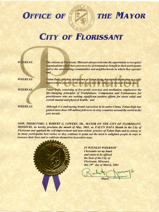 鉴此,我,罗伯特.劳瑞,密苏里州伏洛瑞森特市市长,特此褒奖2003年5月份为伏洛瑞森特市“法轮大法月”,并且赞扬法轮大法提倡的自我提高和非暴力,对其众多的修炼者表达最诚挚的祝福,祝愿他们继续指出人们需要觉悟,应当珍惜生命和修炼自己。