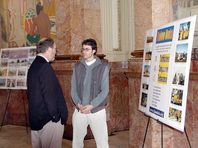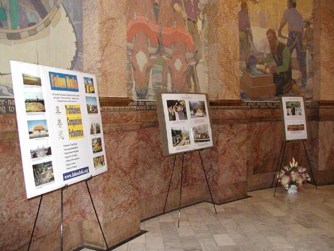 图片展的设置在议会大厦第一层的中央大厅,十分引人注目,只要是来到议会大厦的人都会看到这些展板。自从图片展出以来,确实吸引了许多人前来观看展板,有些人还不时地询问在旁边的法轮功学员。有一位州议员还特意打电话给一位法轮功学员,说他看过了图片展并表示感谢。还有一位参观者说,他一九九九年曾在天安门广场眼目睹了中国警察殴打法轮功学员,从那以后他一直很关注法轮功的情况。